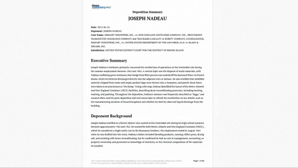 In the complex world of litigation, every detail counts, but time is scarce. How can you quickly distill lengthy deposition transcripts into concise, digestible summaries to increase productivity and accelerate case strategy? Say hello to Deposummary Pro™ .